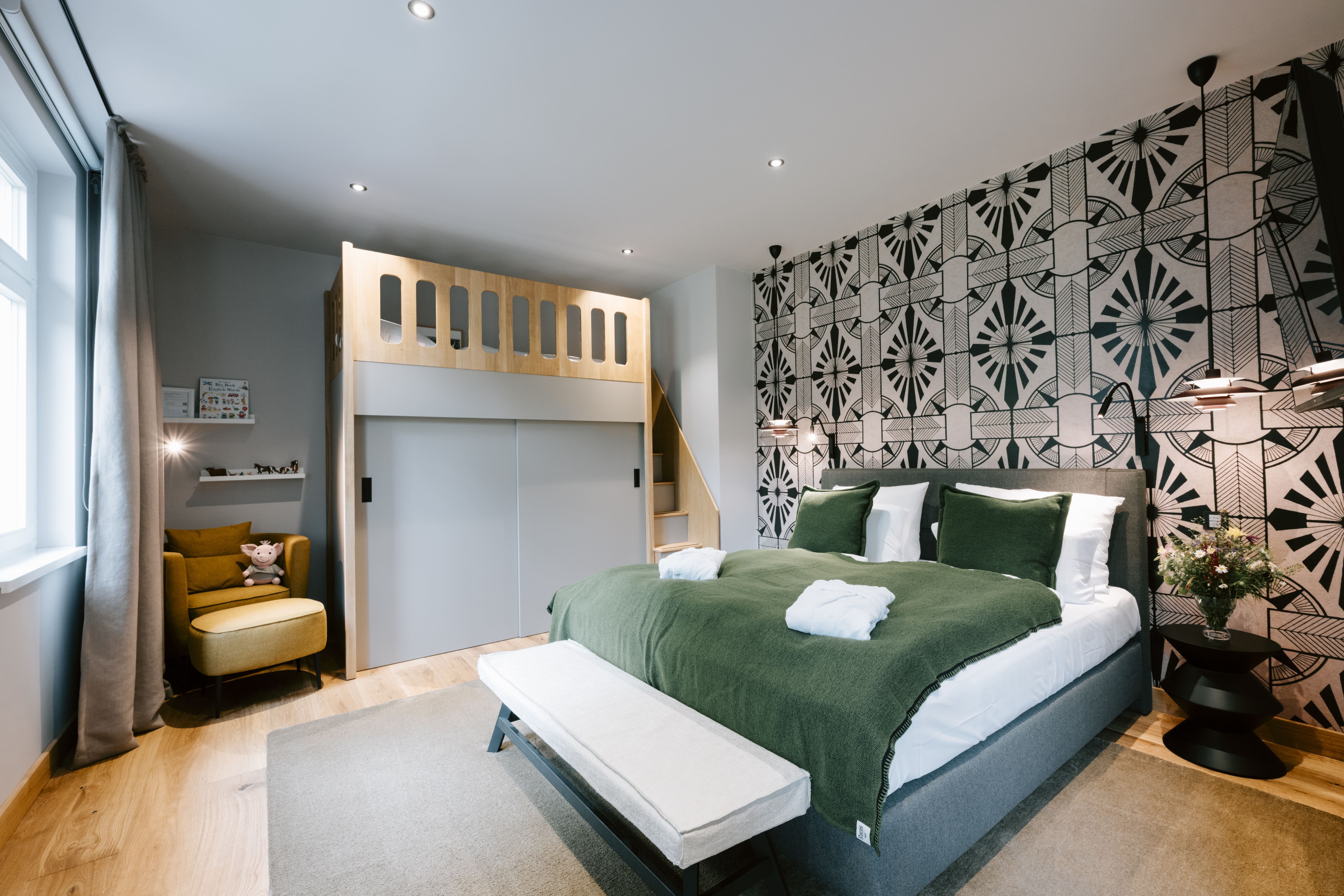 Moderne Familien-Suite im Erdgeschoss auf dem Pferdehof mit Terrasse sowie Blick zu den Stallungen und Waldlichtung, zum Reitplatz und Spielplatz.